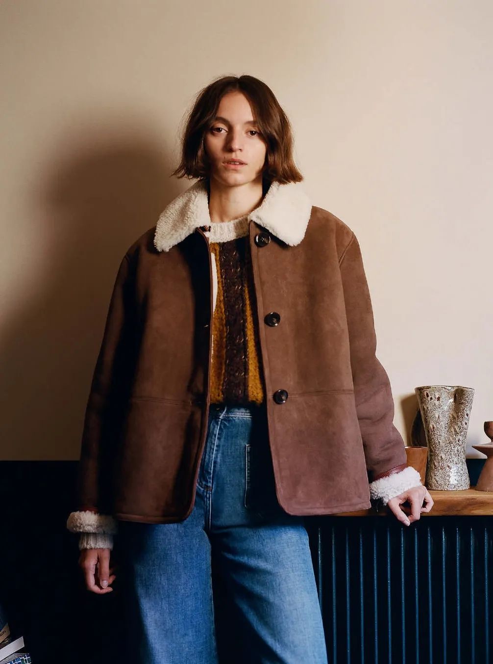 选择将大豆黄衬衫、高领衫作为内搭,配饰是提升整体感的关键。