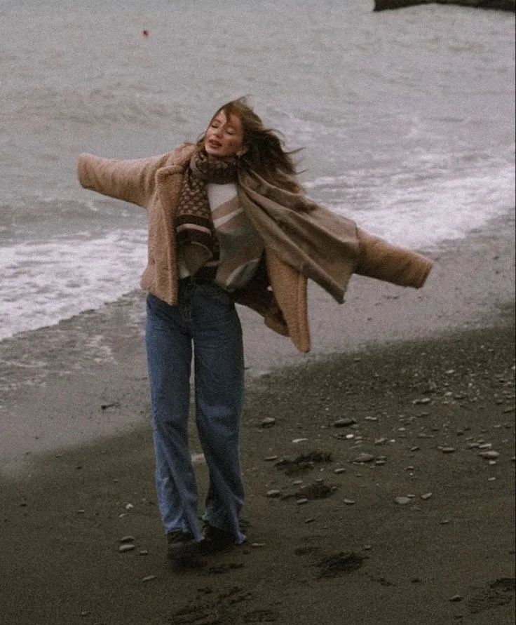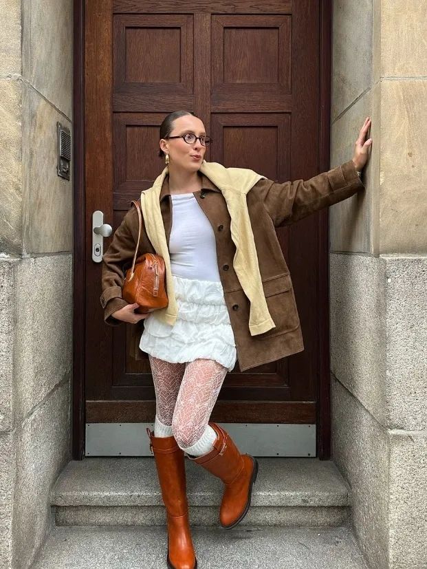 也可以参考下面的搭配,用深棕色外套搭配浅棕色裙子,鞋子可以选择短靴、高跟鞋,把氛围感拉满。