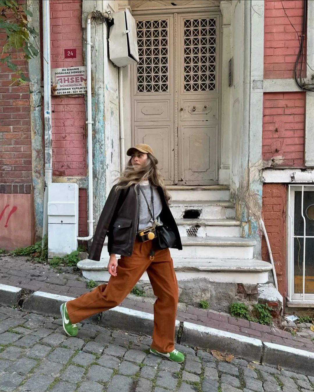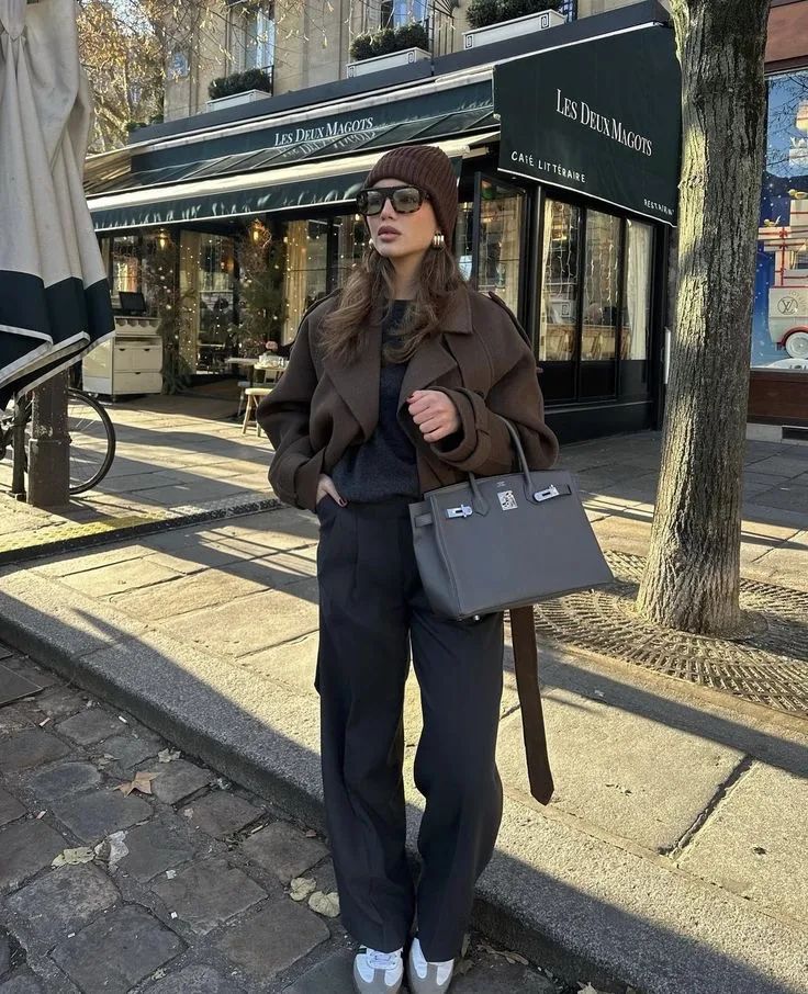 棕色短款外套搭配灰色阔腿裤,再搭一个灰色包包,由内而外散发出的自信与美丽。