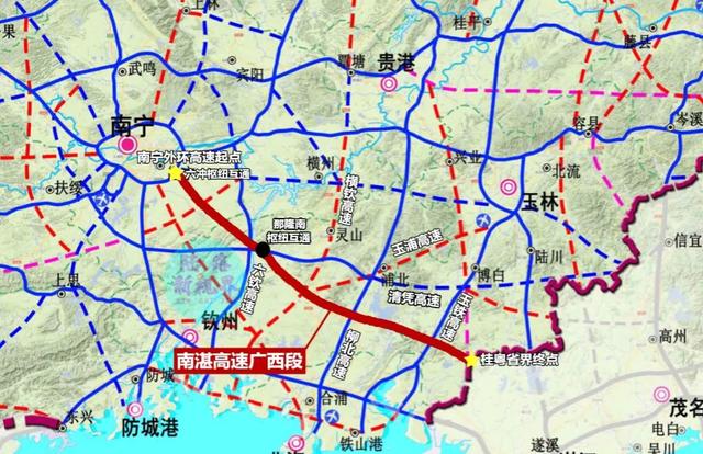 南湛高速就是南宁—湛江高速公路,连接广西南宁和广东湛江的高速公路,南湛高速的广西段早在2020年3月28日开工建设 ,2024年6月18日通车运营,广东段预计于2024年动工建设,预计在2027年建成通车。