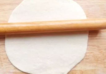 4、揉面板上撒适量的面粉防粘,把发酵好的面团取出,用手拍扁后,再用擀面杖擀成大的片状,不要擀太薄,稍微有点厚度比较好。