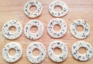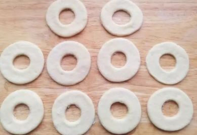 5、然后用甜甜圈模具按压出形状来,没有甜甜圈模具的话,就用圆形杯口来按压也可以