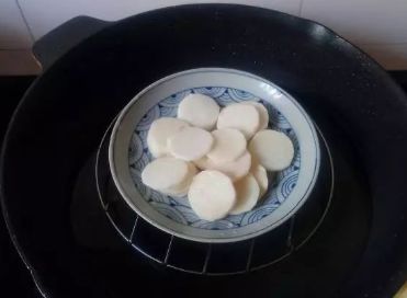 1、山药去皮后切成片状,放在盘子内,送入锅中隔水蒸熟。建议大家蒸的时候,盘子表面最好盖张耐高温保鲜膜,这样可以避免山药吸收过多水分