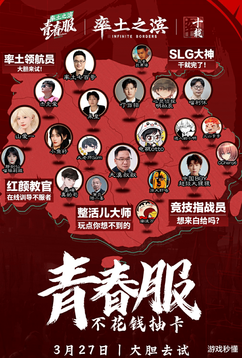 大家耳熟能详的各大顶流博主,比如中国boy、电棍otto、大漠叔叔等都被邀请过来,作为率土青春服公测的“青春领航员”。