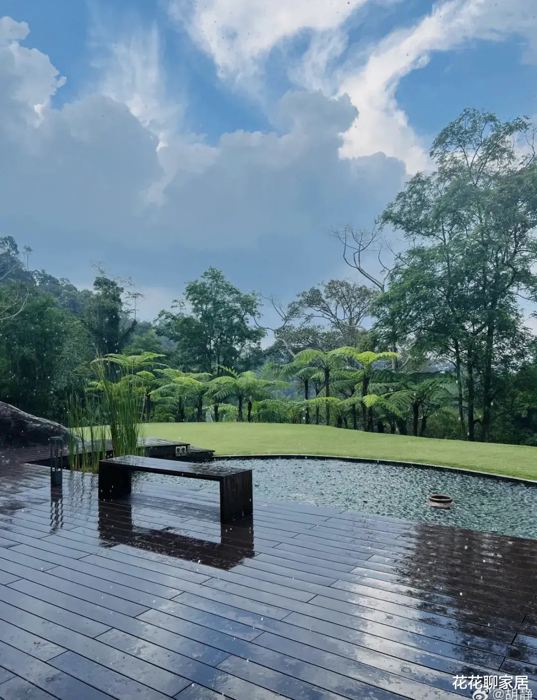胡静的家,被热带植物环绕,仿佛一个生机勃勃的绿洲。家中不仅有起伏的山丘、翠绿的草坪,还有一个人工湖,增添了几分宁静与雅致。