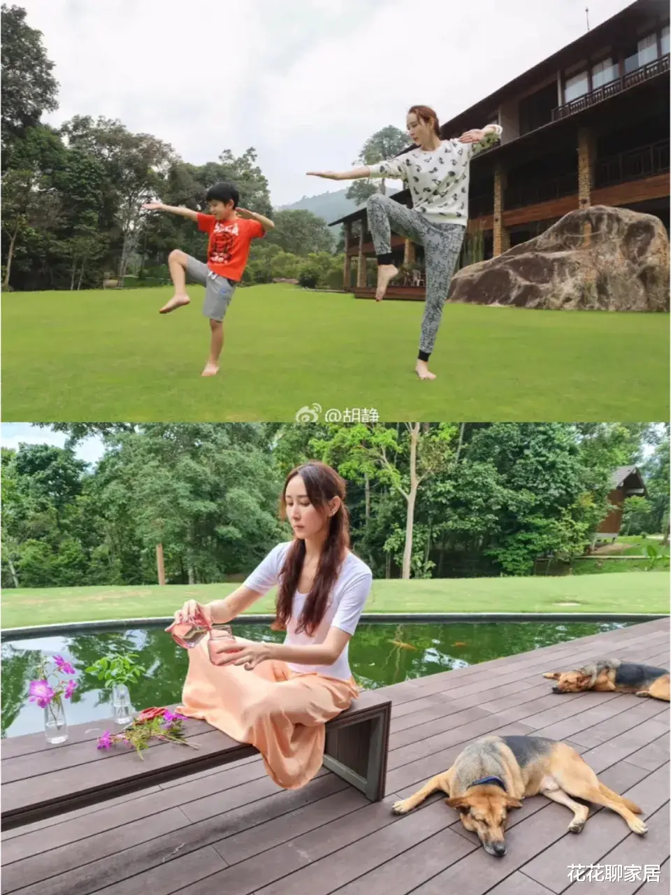 在这片宽敞的草坪上,胡静与她的儿子一起嬉戏、一起做运动,享受着母子间珍贵的亲密时刻。