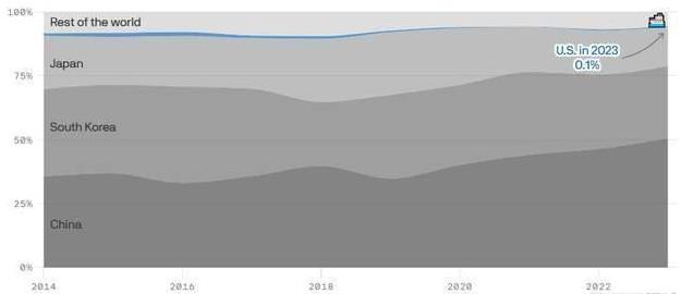 据数据显示,截至到2022年底,中国登记在建的船只是1794艘,而同期的美国只有5艘。而从二战到现在,巅峰时期曾有万艘悬挂美国国旗的商船,如今只有80艘,而中国却有5500艘。而根据美国海军情报部门估计,中国的造船能力已经远远超过美国,达到了232倍。根据央视新闻1月16日发布的最新数据,中国在2024年全年的造船业表现依然强劲,造船完工量、新接订单量以及手持订单量这三项关键指标,已经连续15年稳居全球榜首。