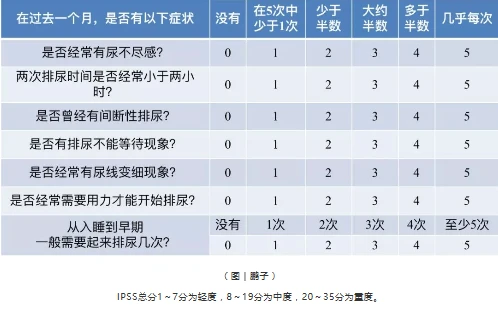 日常生活中可以用前列腺症状评分(IPSS)进行自我评估症状严重程度。