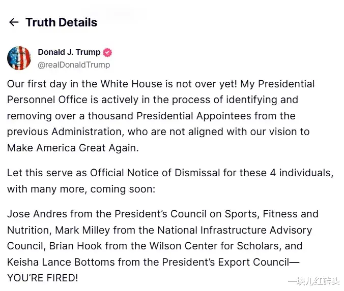 与此同时,特朗普还发布了针对四名拜登政府成员的正式解职通知,包括白宫体育、健身和营养委员会联席主席何塞・安德烈斯,国家基础设施咨询委员会成员(同时也是前参谋长联席会议主席)马克・米利,威尔逊学者中心研究员布莱恩・胡克,以及来自总统出口委员会的凯莎・兰斯・鲍姆斯 。