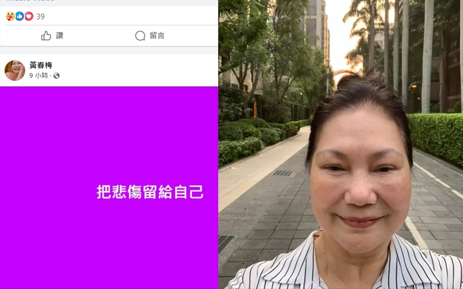 2月10日深夜,徐妈妈(黄春梅)在大S过世后,首度发文称,“把悲伤留给自己”。