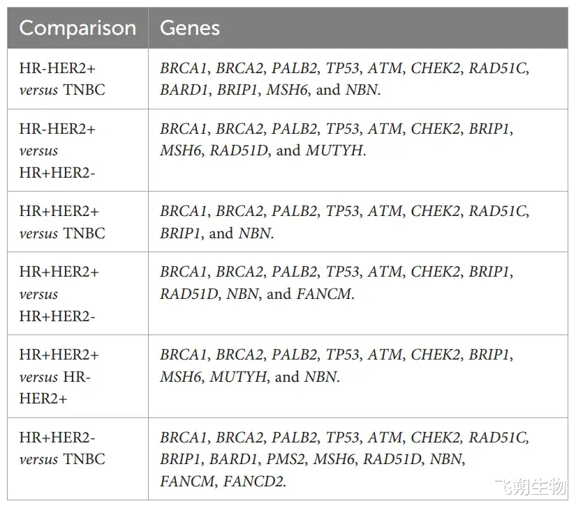 此外,研究还观察到BRCA2基因的胚系变异在对比HER2阳性亚型时,仅在与三阴性乳腺癌(TNBC)亚型相比较时,才表现出较高的一致性,即BRCA2基因的胚系变异仅在与HER2阳性相比时才发现易患TNBC(图2)。这一现象揭示了BRCA2基因在乳腺癌不同亚型中的差异性作用和乳腺癌异质性的深层次原因。