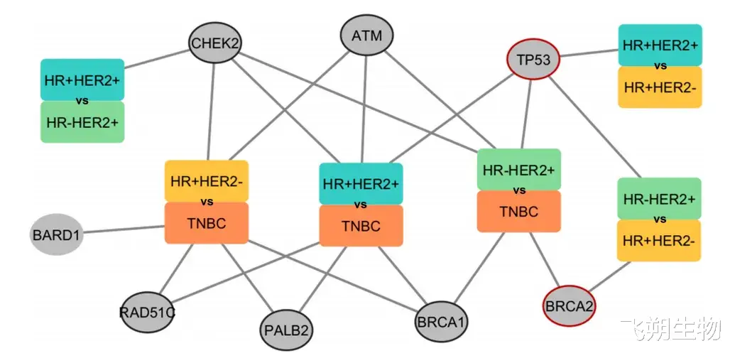 为了深入理解引发不同乳腺癌亚型易感性的遗传因素,该研究对比分析了两组含有胚系变异的共有基因序列。通过对HER2阳性亚型与HER2阴性亚型进行细致的对比分析,观察到TP53基因的胚系变异在这两种亚型中呈现出显著不同的特征,具体表现为排他性(图2)。这一发现突出了TP53基因在乳腺癌发生发展中的关键作用,进一步强调了其在癌症易感性中的核心地位。