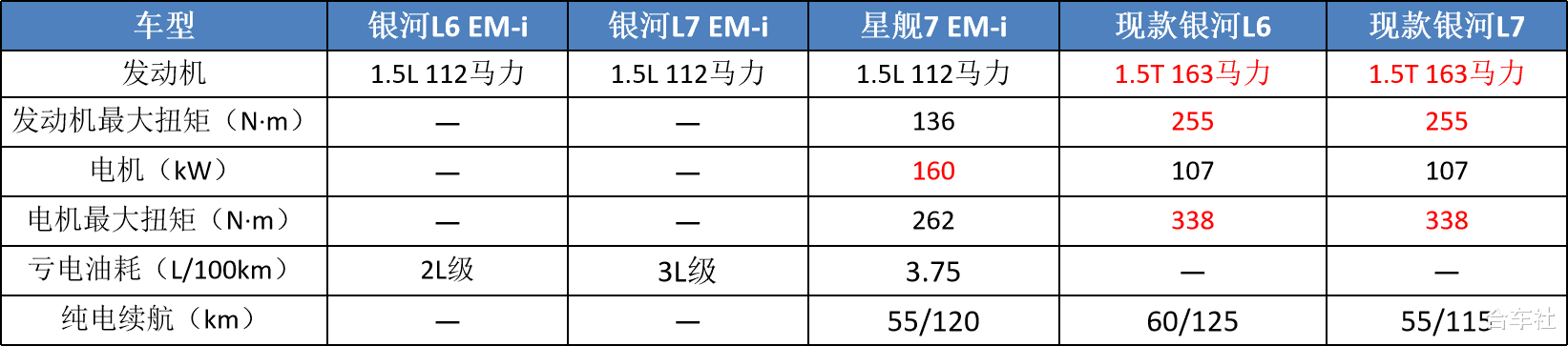 至于电机、续航、油耗等,目前并没有公布十分具体的信息,官方只是表示银河L6 EM-i的油耗能去到2L级,银河L7的油耗去到3L级。电机部分可大致参考星舰7的160kW(218马力)电机,现款L6、L7的电机功率为107kW(146马力)。