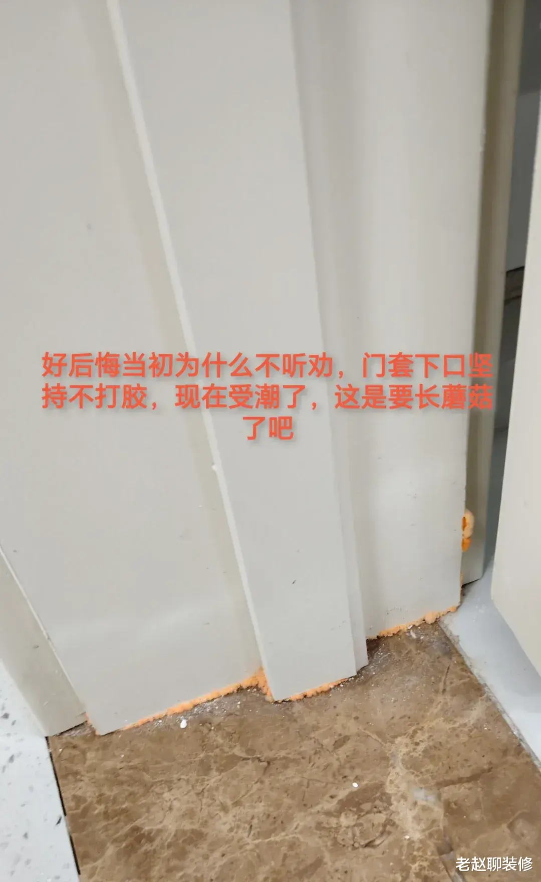 05、门缝要做封胶处理,大部分厂家装好门之后只是在门套线压着墙的地方做封胶处理,但门套板和套线接触地面的地方也要封胶处理,这是另外又上了一道保险,就是最大限度的避免水汽对门套进行破坏。