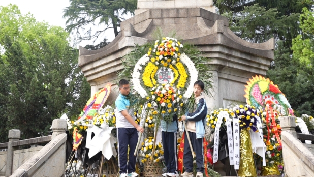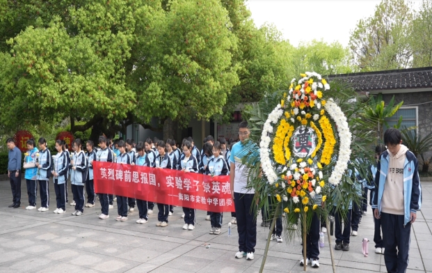 下午3时,师生们从学校整队出发,徒步前往岳屏公园英雄纪念碑。细雨微蒙中,青松苍劲挺拔,纪念碑巍然矗立。全体师生列队肃立,垂首默哀三分钟,向为民族独立、人民解放献出生命的英烈致以深切追思。学生代表缓步上前,郑重献上花篮,白菊与黄菊交织的挽联上,"英雄碑前思报国 实验学子祭英魂"在春风中轻轻摇曳。