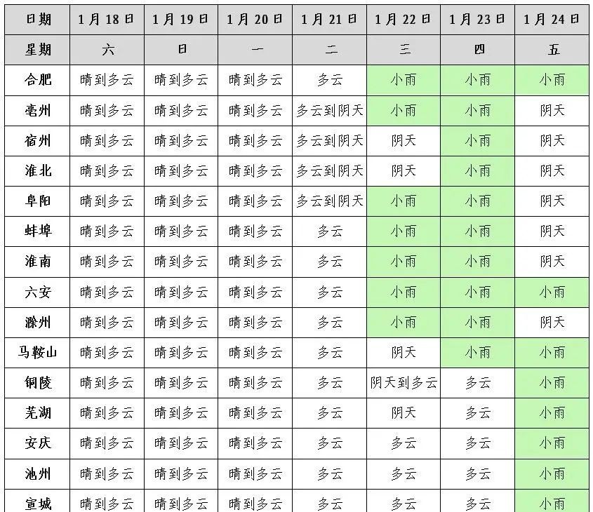 具体到每天,咱们也简单说说。18号到20号,依旧是晴天到多云的好天气,抓紧时间享受吧!21号,淮北可能有点阴天,淮河以南还是多云为主。22号到23号,江北地区可能会飘点小雨,江南还算不错,24号全省阴天,部分地区有小雨。总之,暖和的时候要抓紧,冷的时候,咱们就老老实实待在家里,喝喝热水,看看电视,暖暖和和过日子。