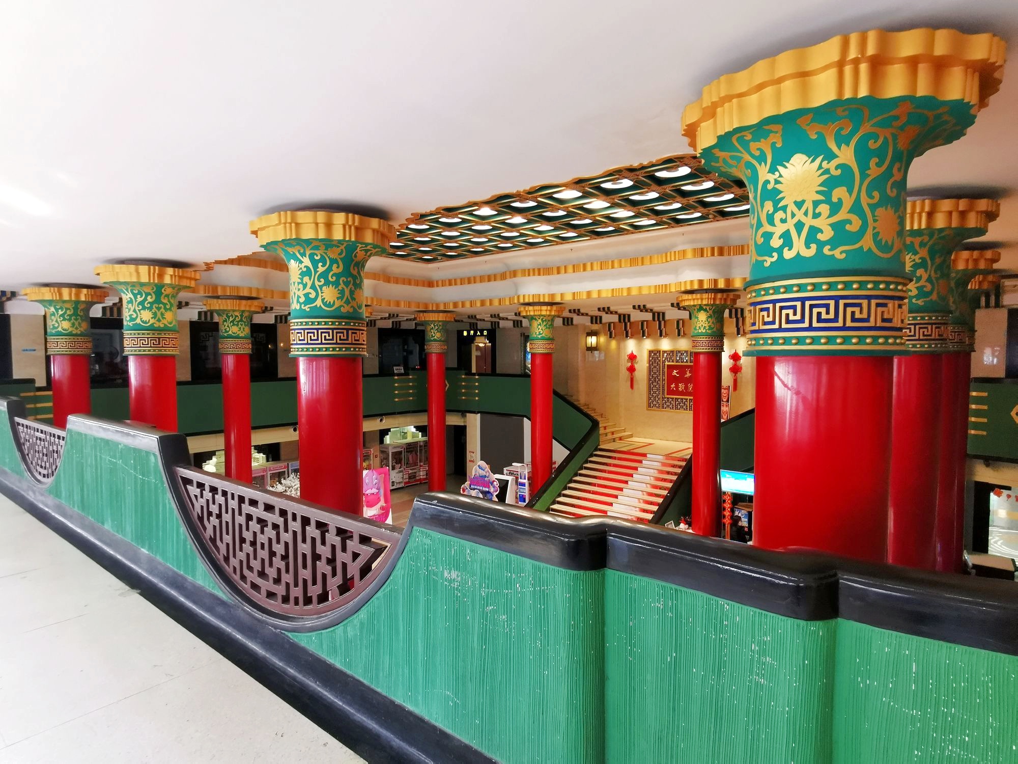 门厅内的天花、墙壁、梁枋彩绘以及栏杆扶手雕饰。