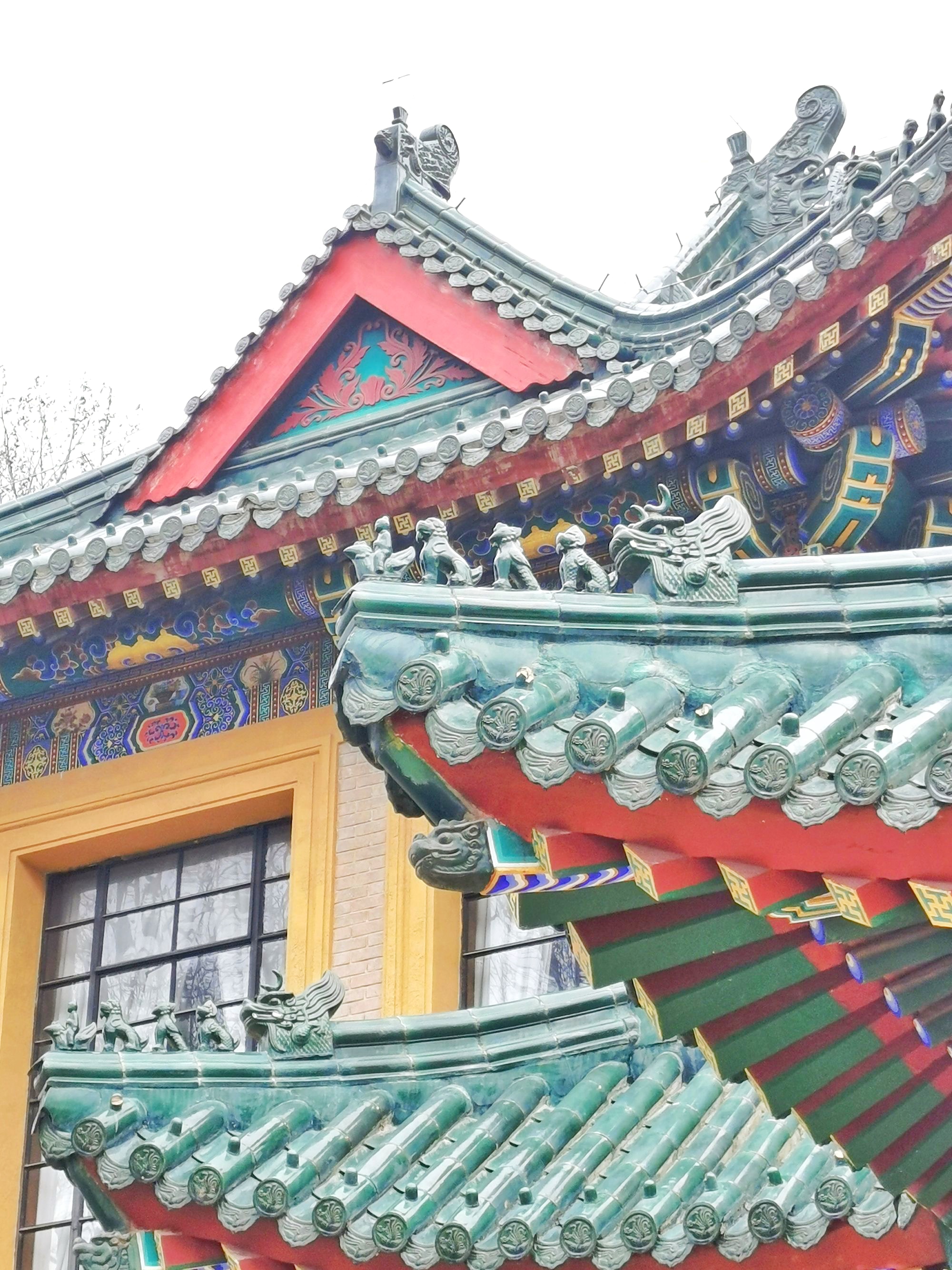 美龄宫坐南面北,正对着中山陵。三层主体建筑,宫殿式重檐歇山顶,覆盖着绿色琉璃瓦,雕梁画栋,挑角飞檐。