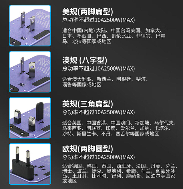 ▲▲搭配多种规格的插头,可以实现各国标准的任意转换。