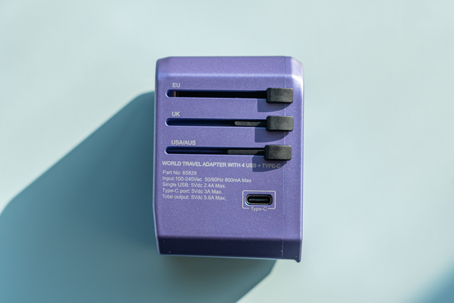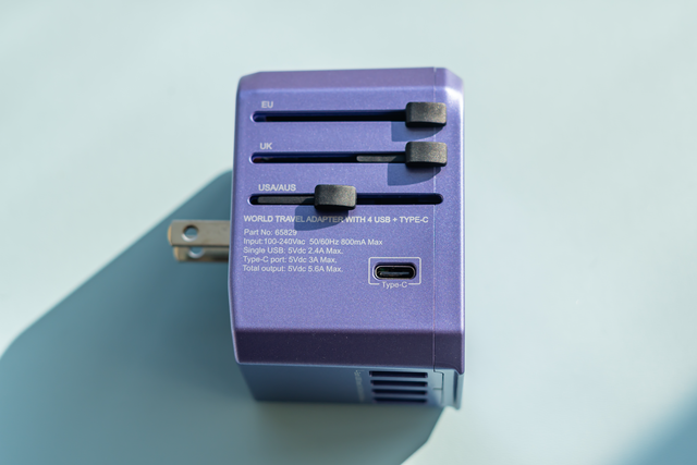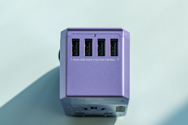 ▲▲我入手的威宝旅行用转换器是28W的版本,带有4个USB-A接口和一个Type-C接口,合计5个接口输出共DC5V/5.6A,A端口单口最大输出2.4A,C口最大输出3A。