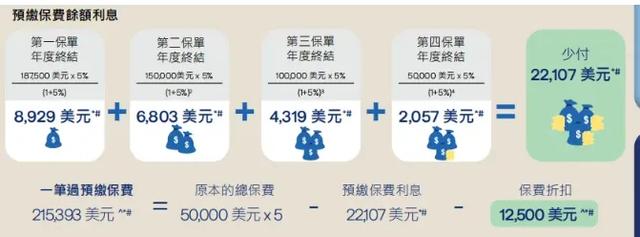 假设投保「瑞骏万用寿险计划」,选择 5 年保费缴付期,每年缴纳 50,000 美元保费,便能够享有 25%的保费折扣,如果申请一次性缴付 5 年的保费,预缴保费还能够享受每年 5%的预缴保利率,总计少支付 34,607 美元。