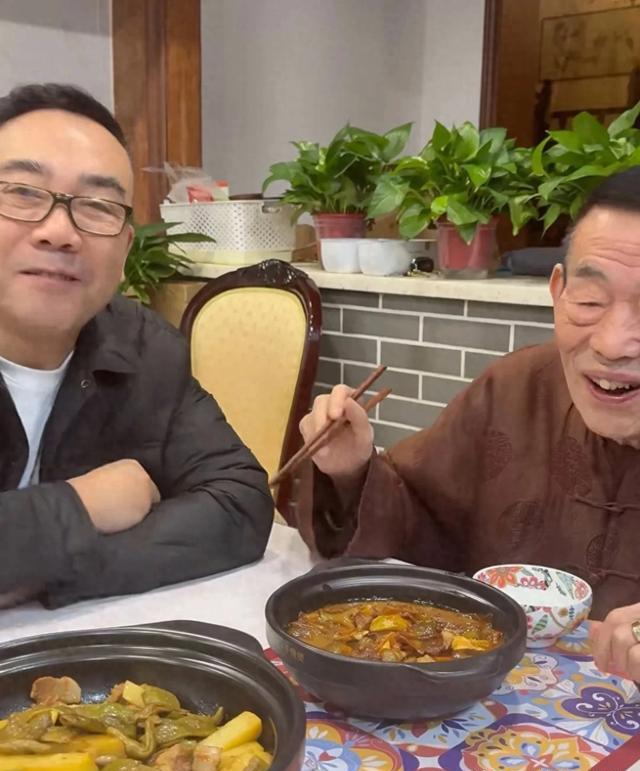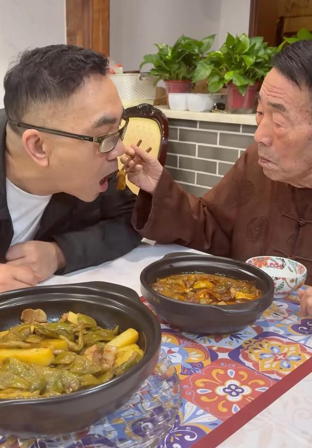 视频开头,杨议站在桌边,要父亲尝尝自己刚做好的茄子:“您尝尝,杨老五做的。”