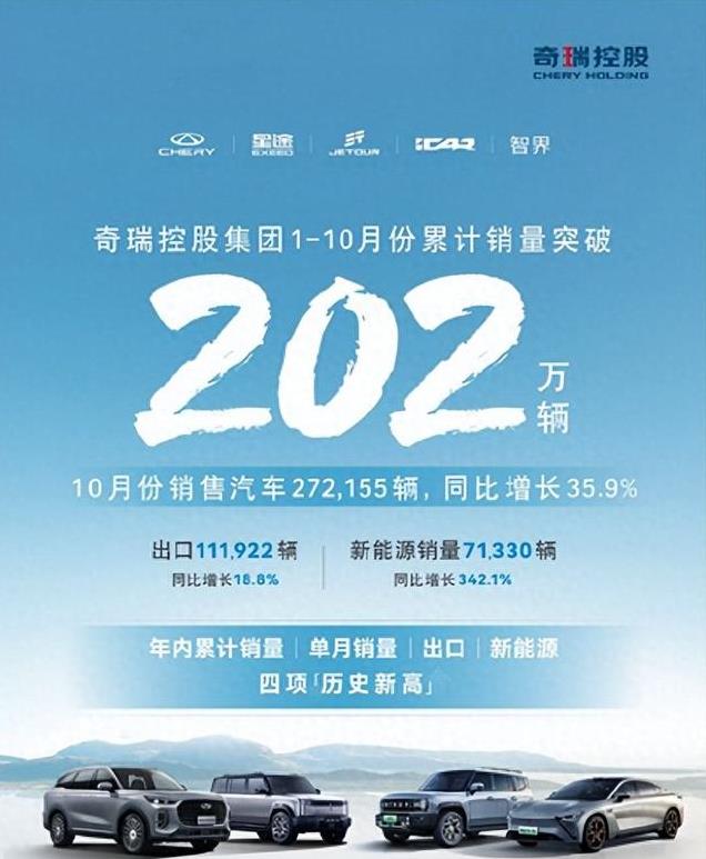 奇瑞控股集团近日公布了10月的销量成绩,272155辆的月销量在同比增长35.9%的同时助力奇瑞全年的销量达到了2024948辆,创造了奇瑞的年销量记录。也就是说今年的奇瑞仅用了10个月就超越了去年的同期水平。