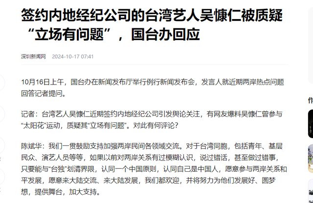 对此国台办也回应吴慷仁立场这件事情:如果对两岸的关系有过模糊的认知,或者说过错话做过错事,只要能与“台独”华划清界限,来大陆发展我们都欢迎。
