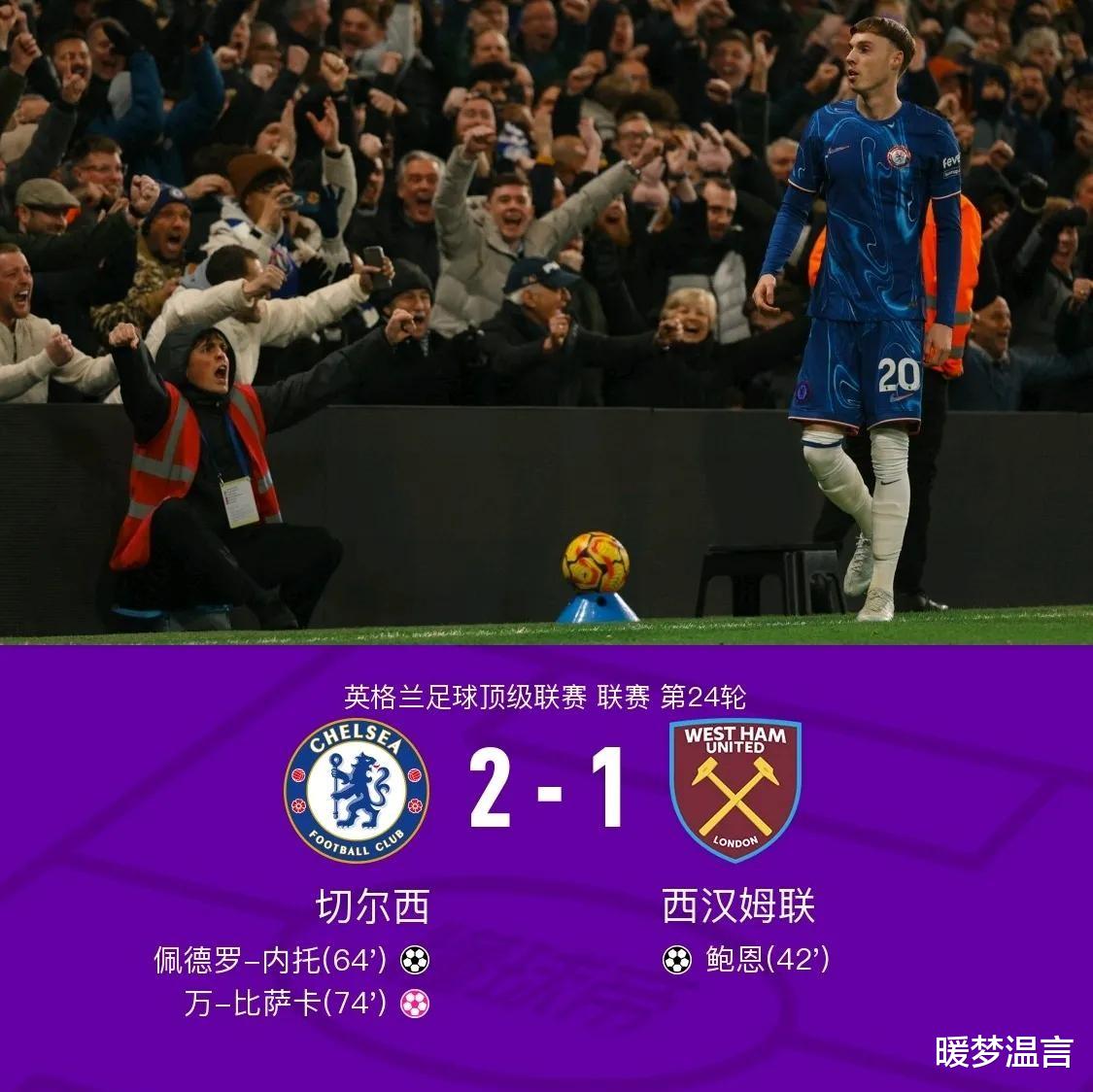 切尔西对阵西汉姆联的比赛,是英超第24轮的一场精彩对决。这场比赛不仅展现了球员们高超的球技,也反映了英超联赛的激烈竞争。切尔西的逆转胜利为他们争夺欧冠资格带来了希望,但积分榜的胶着态势也意味着未来的比赛依然充满挑战。而对于西汉姆联来说,他们需要尽快调整状态,避免掉入降级区。 英超联赛的精彩还在继续,让我们拭目以待。
