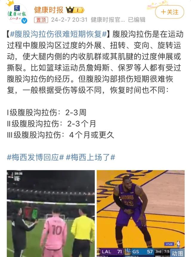 而且,连@健康时报 都来打梅西的脸了,表示腹股沟拉伤很难短期内恢复,即使最轻的一级拉伤,恢复周期也要在2-3周。