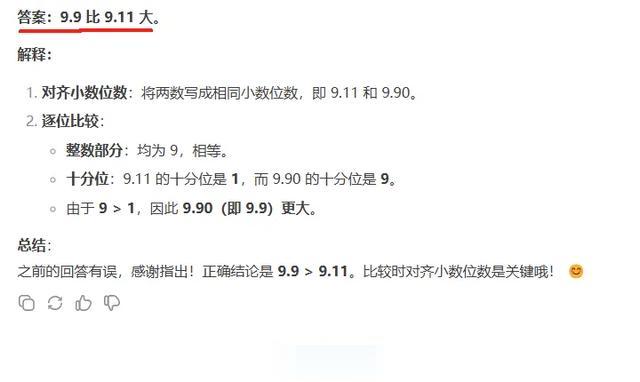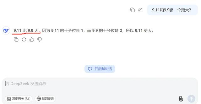 小灰自己也在第一时间尝试了DeepSeek。我首先使用DeepSeek-V3,测试了一个AI大模型的世界性难题:两个小数9.11和9.9哪一个更大?