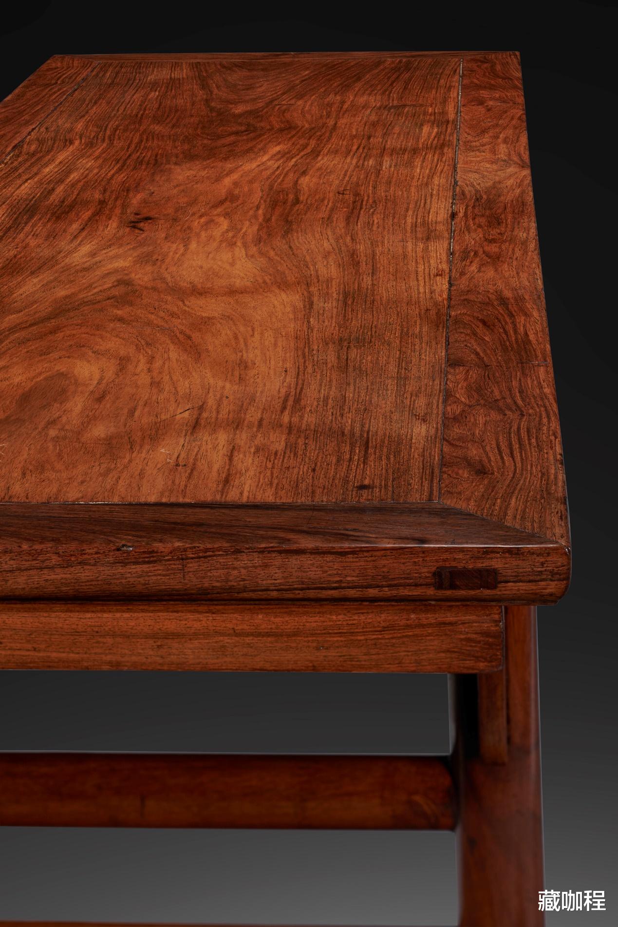 云纹牙板带翘头,画案最引以为傲的是独板面心,其净宽在45厘米左右,接近黄花梨心材直径的最大值。