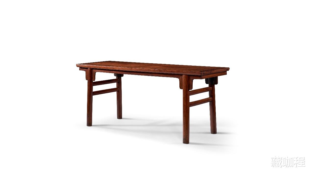 黄花梨夹头榫大画案,长203.8宽66高83.9厘米,年代及估价与前者一模一样,样式和造型并无明显高下之分。