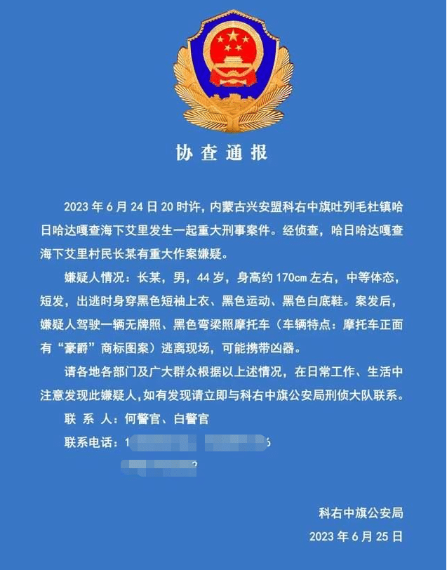 6月25日内蒙古兴安盟科右中旗发布了一则协查通报,原来在6月24日晚上8点左右,哈日哈达嘎查海下艾里发生了一起重大的刑事案件,哈日哈达嘎查海下艾里村民长某有重大的作案嫌疑,该嫌疑人为男性,44岁,中等身材。