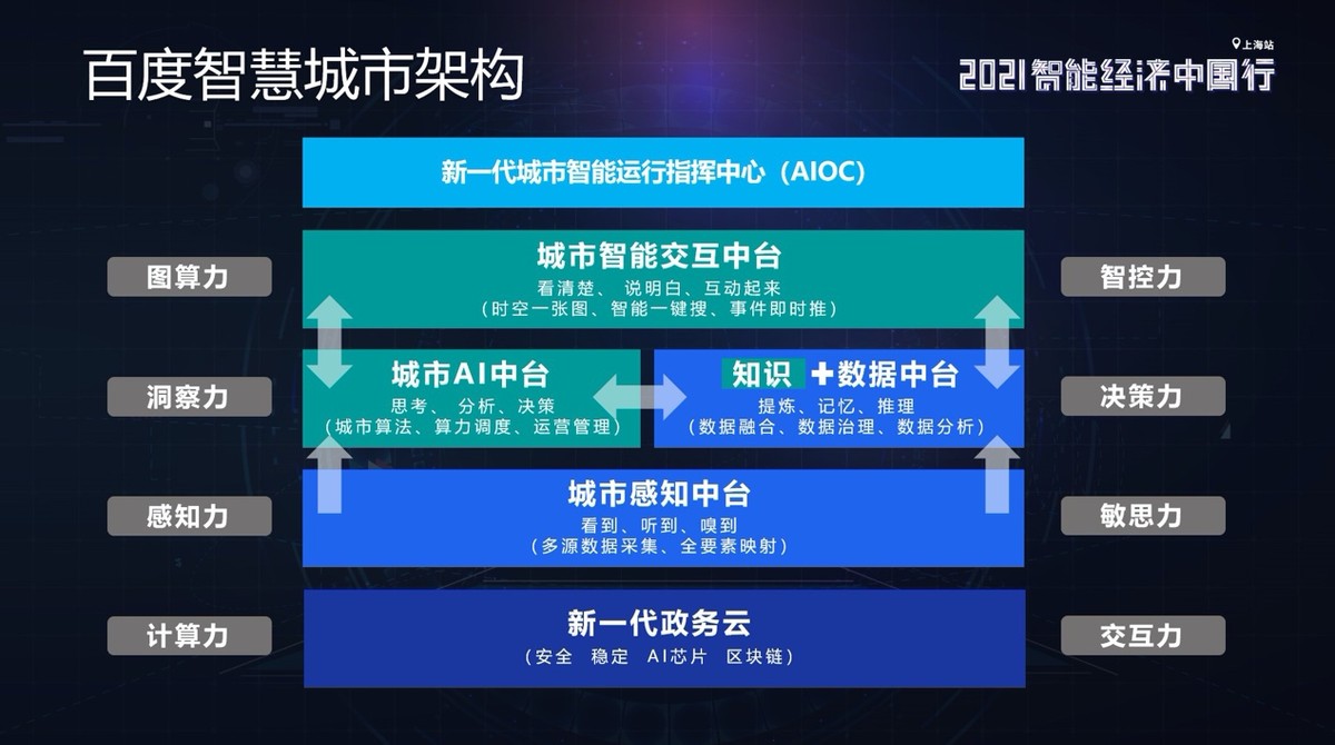“‘十四五’时期,数据作为新的生产要素,人工智能作为新的生产力,云计算作为新的生产工具,将在数字时代来发挥作用,助推我们整个城市数字化转型之路越走越远,越走越快。”百度智能云智慧城市事业部咨询总监刘长宝在会议发言中说到。百度智慧城市将城市的智能化发展分为四个阶段,即计算智能、感知智能、认知智能和决策智能。