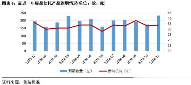 2024年11月共有34家信托公司的233款标品信托产品应到期清算,到期数量环比增加60款,升幅为34.68%。