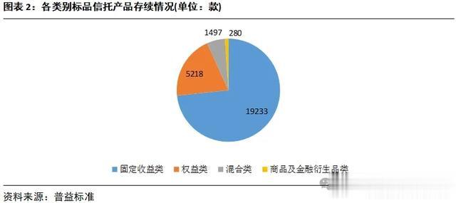 (二)各类别标品信托产品存续情况从产品类别来看,截至2024年11月末存续且披露了类别的26228款标品信托产品中,固定收益类产品19233款,占比73.33%;权益类产品5218款,占比19.89%;混合类产品1497款,占比5.71%;商品及金融衍生品类产品280款,占比1.07%。