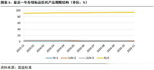 (三)各期限标品信托产品存续情况从产品期限看,截至2024年11月末存续且披露了期限的33301款标品信托产品中,1年期(不含)以下产品13款,占比0.04%,环比下降0.01%;1年期至2年期(不含)产品731款,占比2.20%,环比下降0.16%;2年期至3年期(不含)产品1051款,占比3.16%,环比下降0.16%;3年期以上产品31506款,占比94.61%,环比上升0.33%。