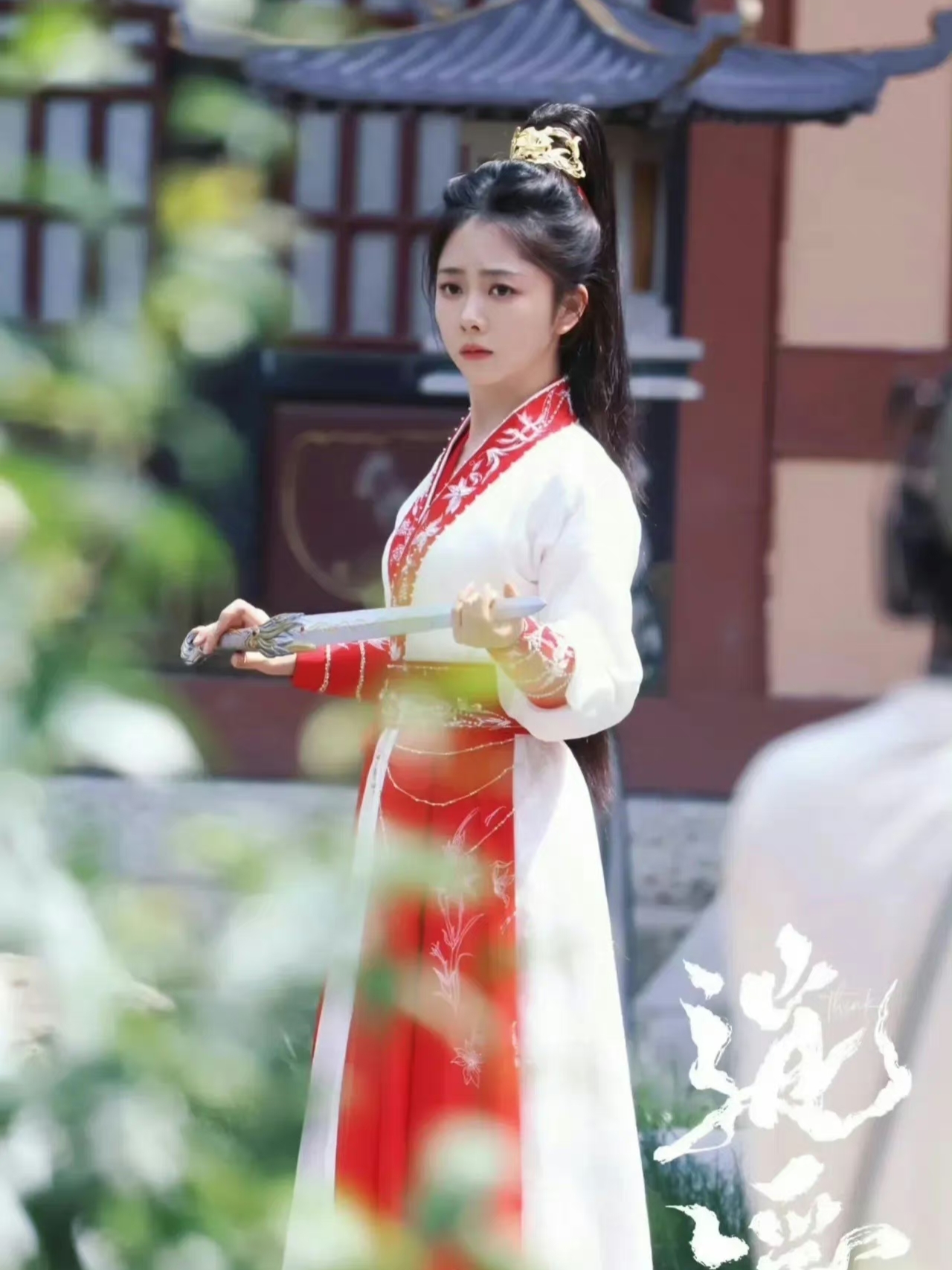 同样具有女侠风范的还有一套红白相间的造型,只不过高马尾的发型在古装剧里太过平常,还是另外几个发型更亮眼一些。