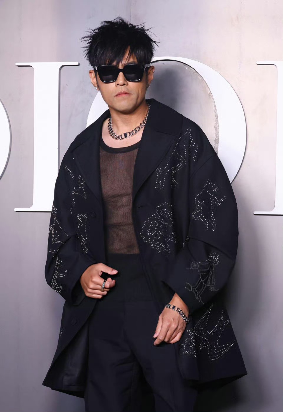 周杰伦身穿迪奥经典印花大衣,搭配黑色墨镜,各种铆钉元素看起来真的是既时髦又时尚。