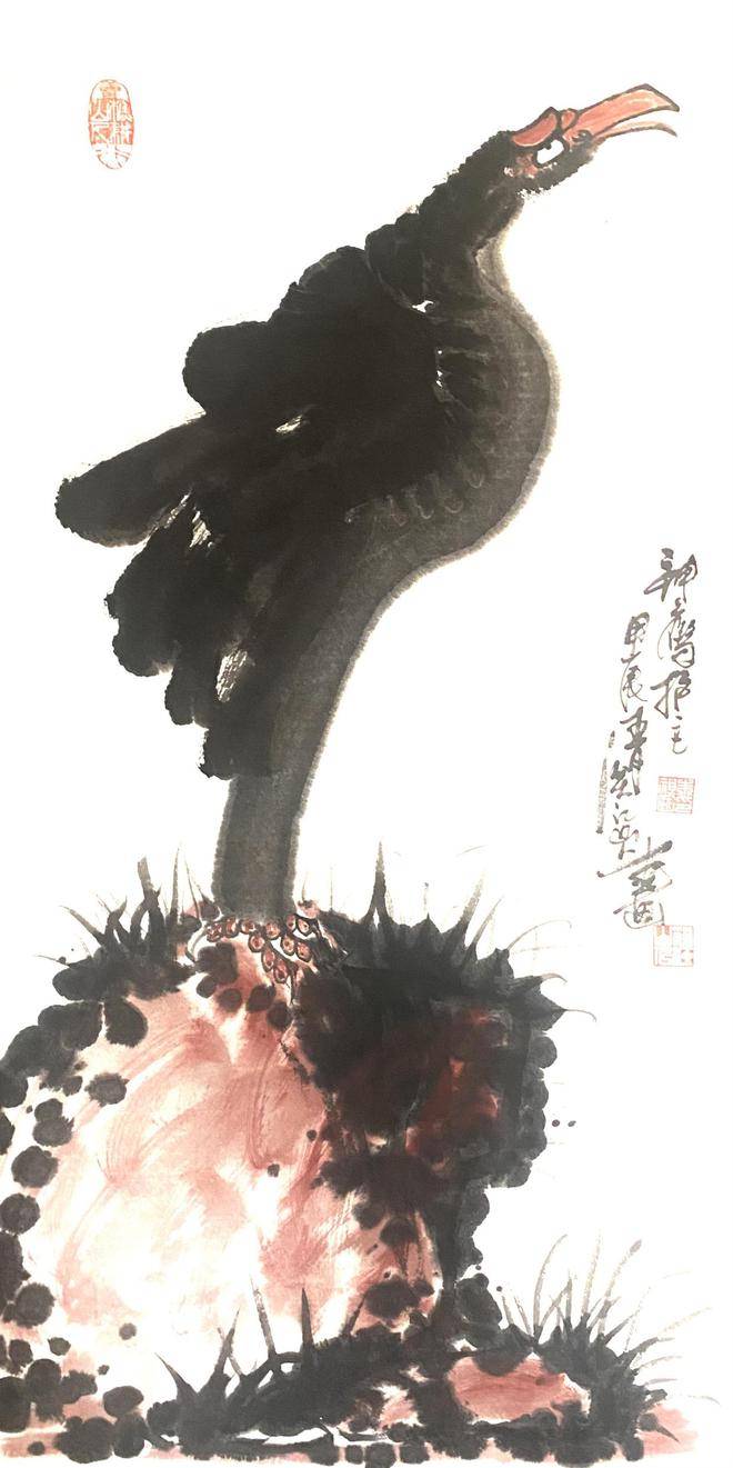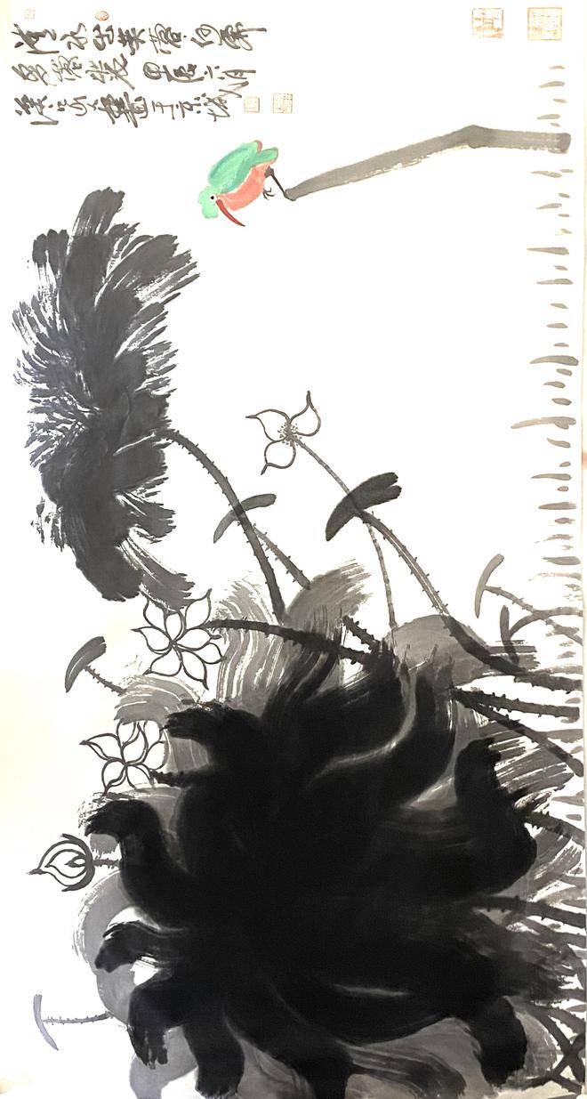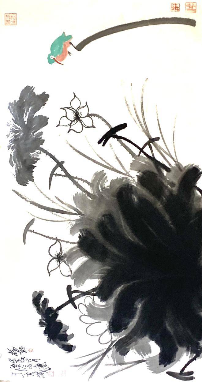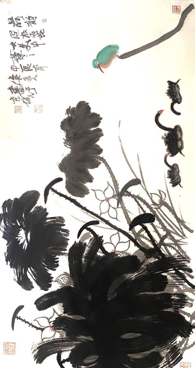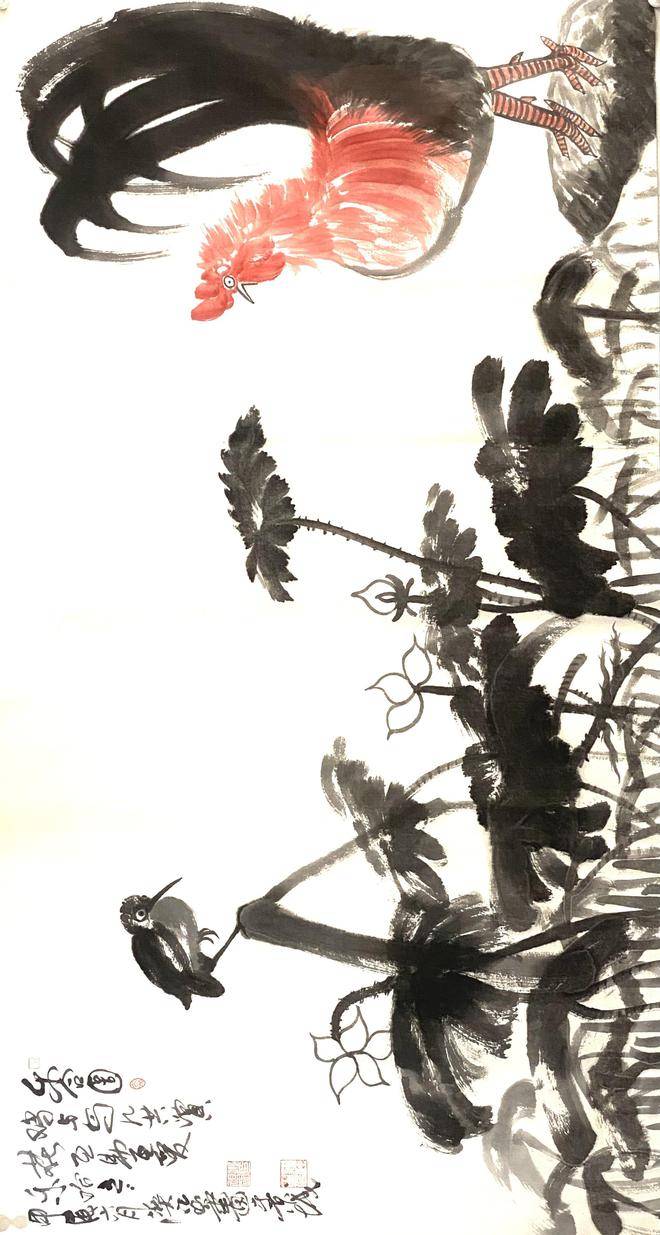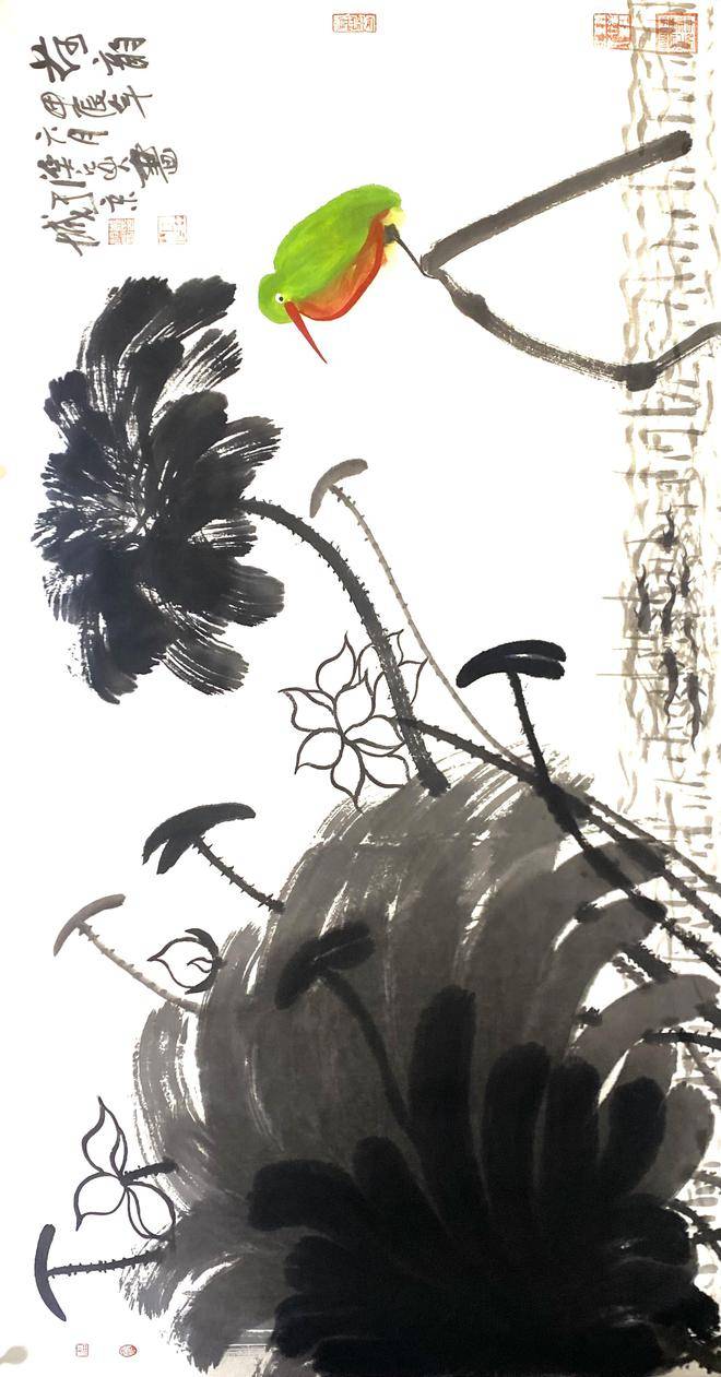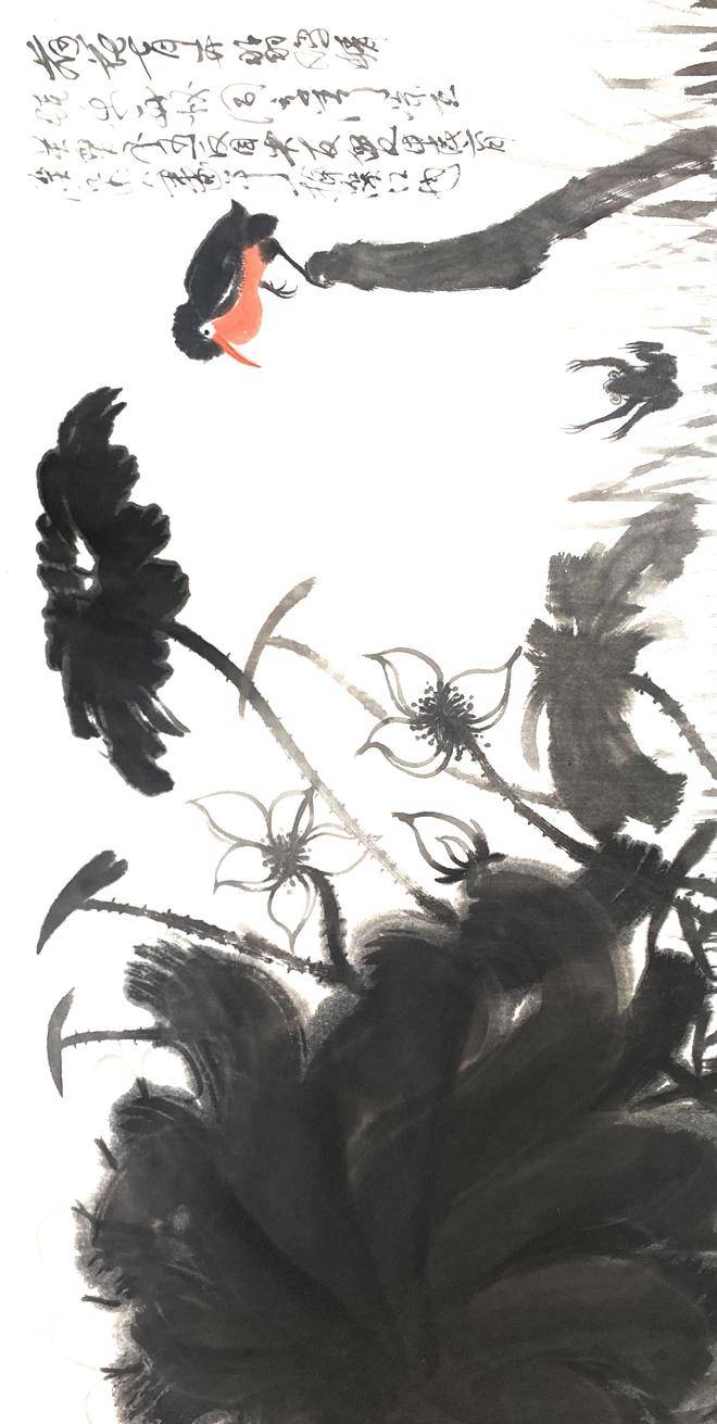 联系到他近几年的各种题材各种尺幅的花鸟画作品,我们不难发现朱祖国先生以其大写意观为艺术创作的指南,以笔墨为媒介、以扬发大写意精神为旨归,表现意象注重得意传神,营构意境力求简约文气,含蓄蕴藉,别有余味。其创作在必然性与偶然性的结合中,感受得以抒发;在自由加制约的迹象中,情感得以表露;在笔墨的张驰有度中,气韵缱绻而来。这就使自己的写意画既成为自我情感倾诉上的一种内在的冲动和表现形式,又成为其写意艺术审美重心自觉转向主体性的标志。