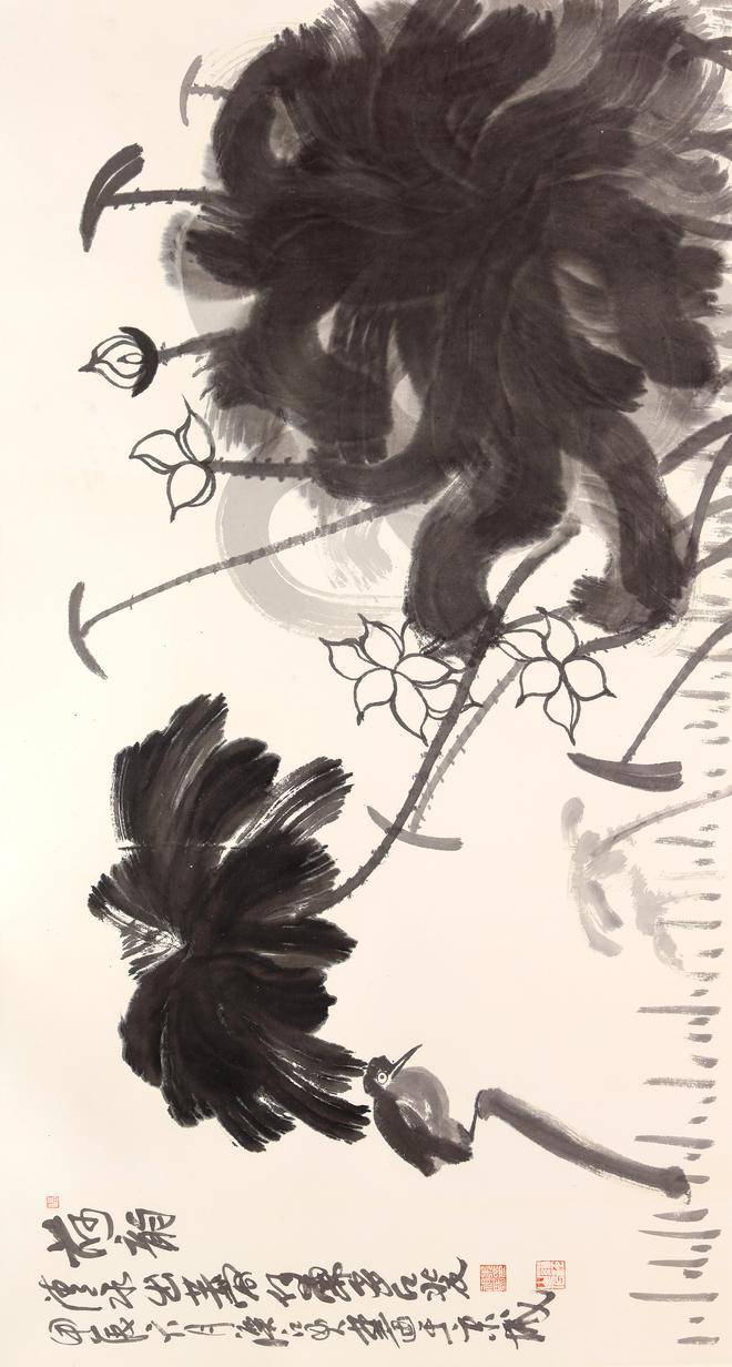 朱祖国在师法李苦禅画风时很好地抓住了其“拙”的审美特点,其花鸟造型的奇拙,笔墨的迟拙,都在朱祖国花鸟的语言表现中得到了自觉的保留。但我们看到,朱祖国的不少作品显然还袭带了潘天寿的画风痕迹,其翘楚的荷瓣,挺峻的荷茎和荷叶的铺蔓以及一些构图的取势都与潘天寿不无关联。但与李苦禅的影响相比,他对潘天寿的吸纳似乎不是流溢于表的。不妨说,朱祖国很好地鉴取了潘氏画风中的“刚峻”的审美因素,并使之内化于骨,从而为自己的花鸟形态构筑了一个坚实而刚健的体骼。