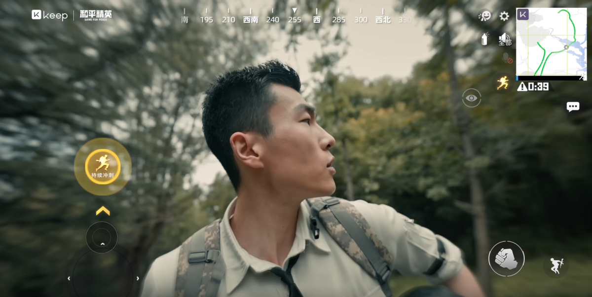 所以这次和平精英和keep的联动,可以说充分地将游戏性结合在了跑步课程中,在课程中用户将化身剧情跑中的主角与队友K组队,来到「循环空间」,一边战斗进圈,一边寻找破除循环的方式,既得到了运动,同时还满足了趣味性。