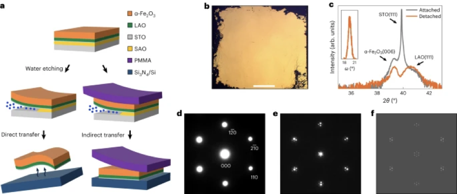 传统上,由于必须在特定的对称匹配的基材上生长这些材料,AFM材料与技术应用的集成一直受 到阻碍。这限制了AFM材料的探索和实际使用,其研究一直停留在实验室,而不是用于现实世界的应用。牛津大学的研究人员克服了这一障碍,开发了一种制造独立式α-Fe2O3纳米膜的方法,这些纳米膜可以分离并转移到各种支架上。这一突破为AFM材料在不同技术平台上的更广泛应用铺平了道路,增强了它们与现有技术的兼容性和集成。