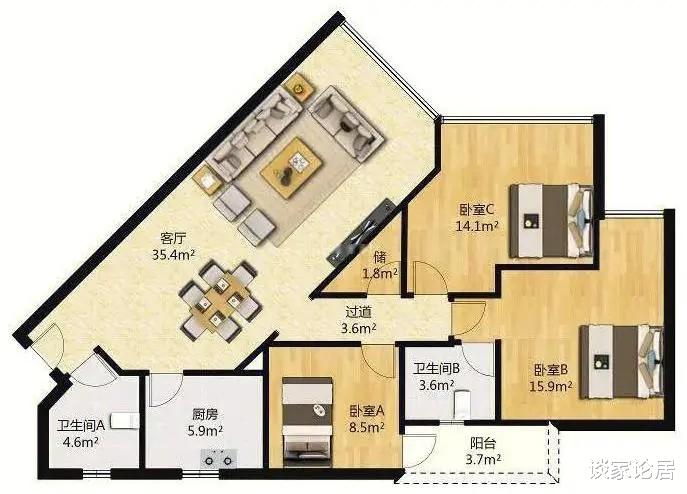 异形户型的室内都不方正,对整体布局造成很大的影响,特别是锐角的墙体,空间狭窄,不用充分利用,基本上这些空间都会浪费。