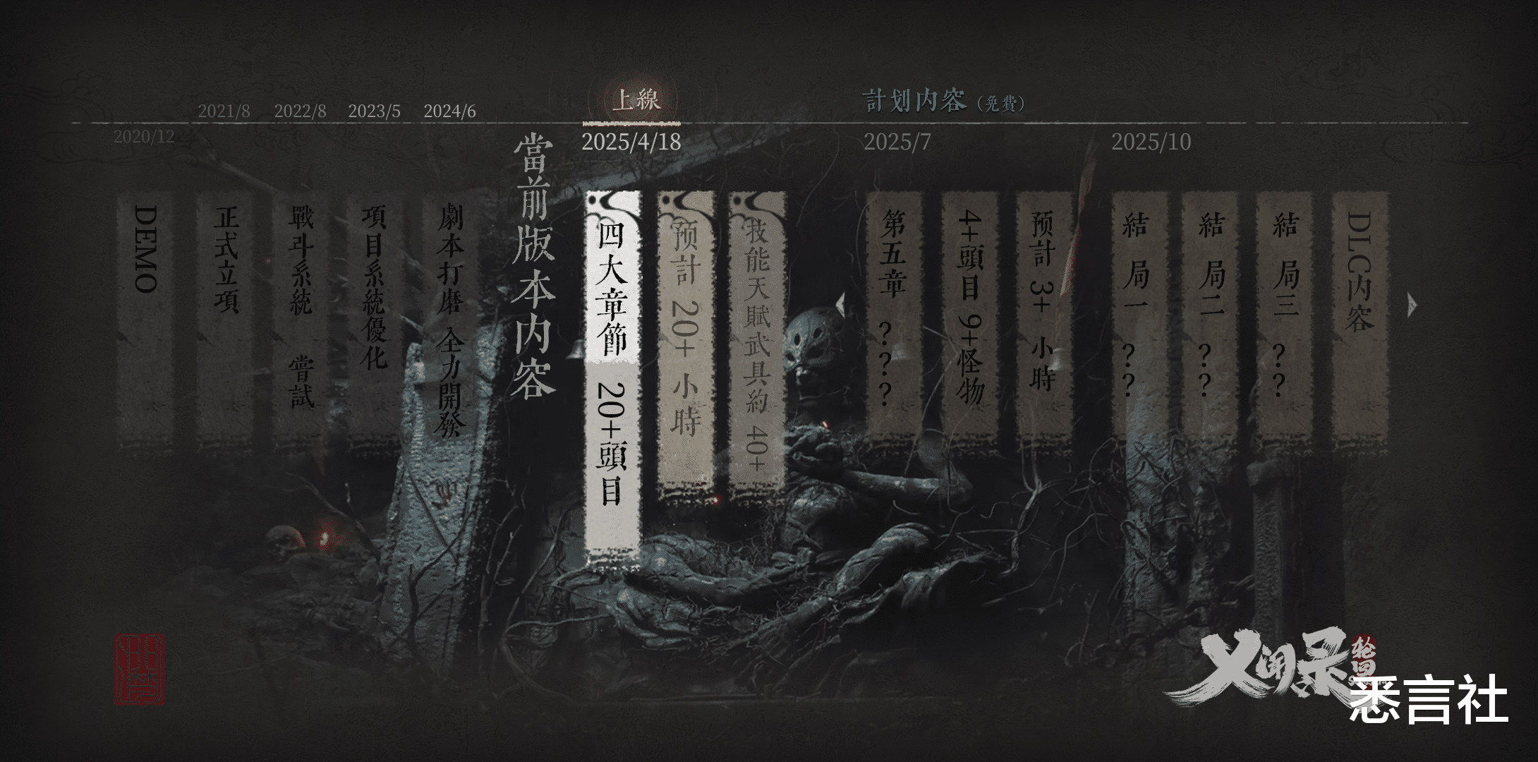游戏首个版本提供20小时以上的主线体验,并承诺后续免费更新新章节、Boss、结局及DLC。官方路线图显示,未来将扩展更多文化元素和玩法内容,值得期待。另外,据天眼查,Runmeng已经登记了《乂闻录:回归》、《乂闻录:超越》、《乂闻录:重生》、《乂闻录:起源》、《乂闻录:崛起》等多个软著,如果市场反响可观,大概率是要把《乂闻录》做成系列游戏了。
