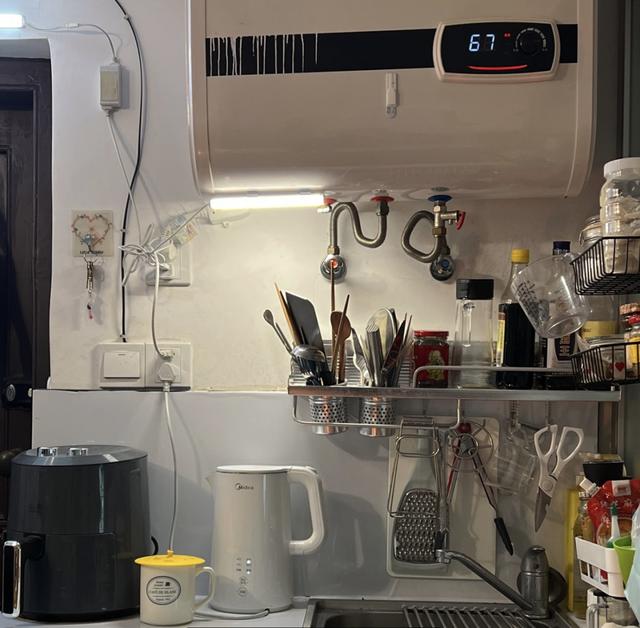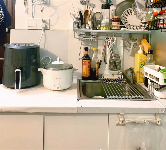 她经常在家做饭,就尽量不出去吃,毕竟上海的餐饮消费很贵。在1平米的小厨房,大部分还是以水煮和空气炸锅为主只能偶尔烧一个不那么重的菜,不然的话,就算打开窗户和门,好几天都散不掉味道。