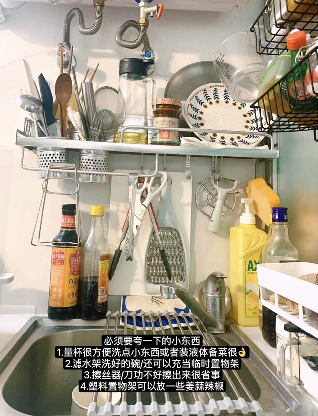 @Fei物人 给我推荐了很多厨房好物,不仅好用而且很便宜,果然是打工人,该省省该花花!橱柜里放满了盘子碗和其他瓶瓶罐罐,台面被利用到了极致,调味品也摆的满满当当。水槽下方也存满了各种生活小电器。