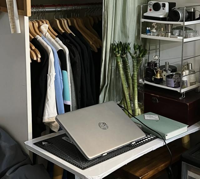 虽然只有一张不到一米宽的单人床,洗衣机当作床头柜,还有一个70cm的衣橱,却成为了她幸福的家。不到1m的台子就是她的迷你厨房,书桌置物架是她的办公区,当然还有个更小更mini的卫浴。