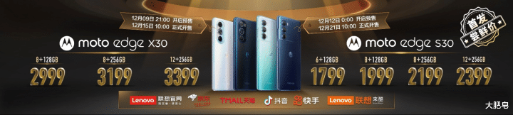 moto edge X30与moto edge S30将于联想官网、京东、天猫、抖音、快手、来酷平台开启预售、正式开售。moto edge X30 8+128GB版本售价3199元,首发尝鲜价2999元;8+256GB版本售价3399元,首发尝鲜价3199元;12+256GB版本售价3599元,首发尝鲜价3399元。12月9日21时开启预售,12月15日10时正式开售。